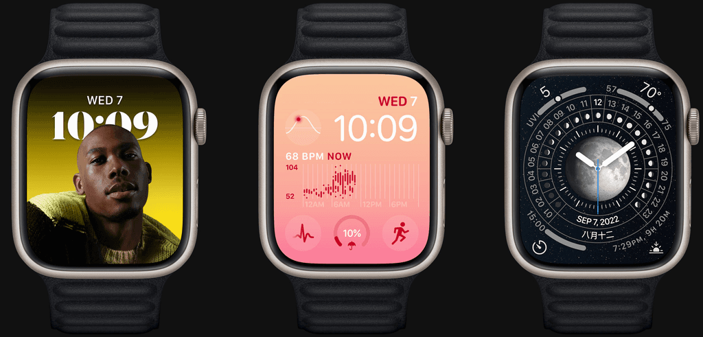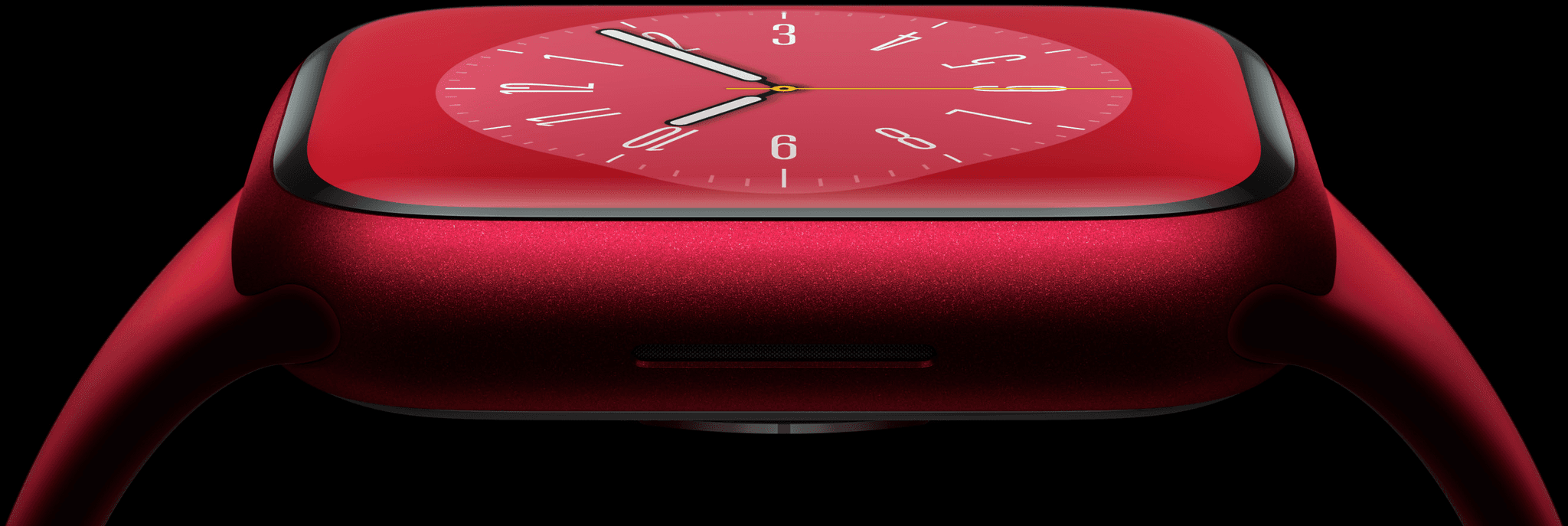 Smooth and seamless. The edge of design. Apple Watch Series 8 features a big, brilliant Always‑On display. Narrow borders push the screen right to the edge, resulting in an elegant integration with the curvature of the case.